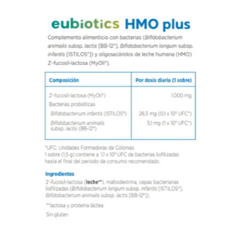 Eubiotics HMO Plus aporta HMO, compuestos que no se digieren directamente, sino que nutren selectivamente a las bacterias beneficiosas, favoreciendo un entorno intestinal más estable y funcional 🌿.